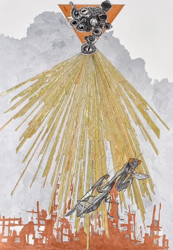 Maria Köfler’s primary artistic medium is drawing. She works on paper with ink, pencil, ballpoint pen, felt-tip, red chalk, chalk, and crayon, to create a surreal, bizarre pictorial world whose complexity defies clear legibility. Based on personal experiences and observations, Köfler transfers social themes such as “eating and being eaten”, greed and fear, fairness and justice to the animal world to reflect human sensitivities on a symbolically charged level. Delicately drawn insects and critters such as flies, mantises, or slugs populate her works and interact against abstractly painted backgrounds. The viewer shudders at fragmented body parts and heads with disturbed, distorted facial expressions; elaborately designed ornaments allude to the traditions of art and craft and remind us of art nouveau-like tendril and frame elements. At the same time, contemporary motifs and symbols of our multimedia reality are repeatedly interspersed. Köfler wants to tell ambiguous stories. She plays with (pre)judgments, visual habits, and contradictions. The gruesome mixes with the decorative; sketch-like elements contrast with hyper-realist drawings. But the seemingly unpleasant animals can also be useful – aesthetically repulsive at first glance but beautiful if viewed from a different angle.